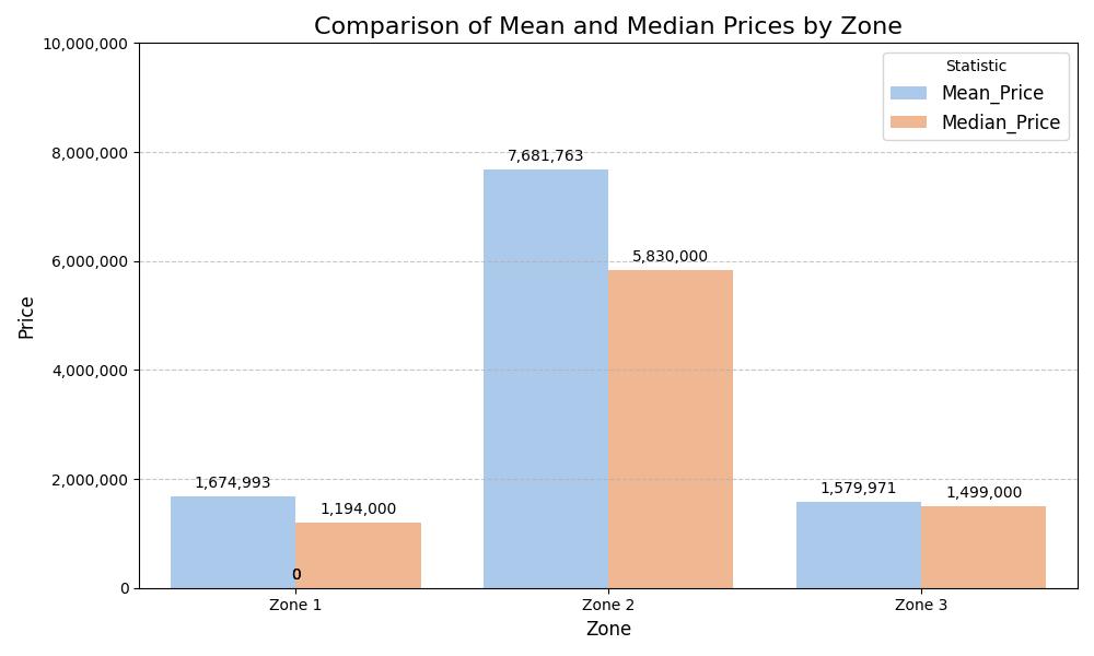 The price distribution across the three zones reveals that Zone 2 has the highest median price, which is 388% and 288% higher than Zone 1 and Zone 3, respectively. This significant disparity can be attributed to Zone 2’s proximity to downtown, historically associated with higher prices due to its prime location, superior infrastructure, abundant amenities, and other factors driving demand.