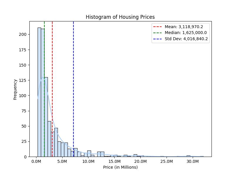 The overall market distribution illustrated by the histogram shows a skewed distribution to the left. This type of shape is common within housing markets due to the existence of expensive properties, particularly in cities with elevated housing costs. The left-skewed distribution indicates that most of the listed properties fall within a relatively ‘affordable’ price range in comparison to luxurious properties.