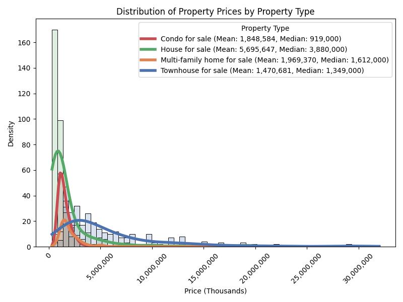 Following the overall market trend, the distribution of property prices is distinctly left-skewed, reflecting a concentration of lower-priced properties with a smaller proportion extending into the luxury segment. However, pricing dynamics vary significantly across property types, giving a complete view of the Vancouver real estate market. Houses stand out as the most expensive category, characterized by the highest median and mean prices, alongside a pronounced right skew that highlights a substantial share of high-priced listings. In contrast, condos feature lower median and mean prices and a less skewed distribution, indicating a more balanced and accessible price range.