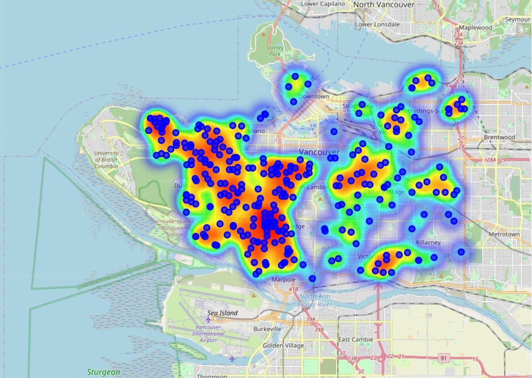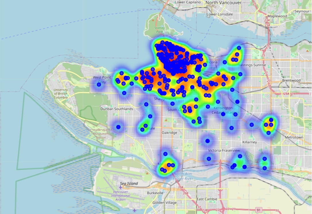 The following heat maps offer insights about the areas where a specific property type has more instances in comparison to others. This information is valuable because provide insights about the market distribution from a location perspective. For example, condos are mostly concentrated around downtown, Coal Harbour and West End. On the other hand, houses are located mostly in areas like West Point Grey, Kitsilano, Arbutus Ridge among others.